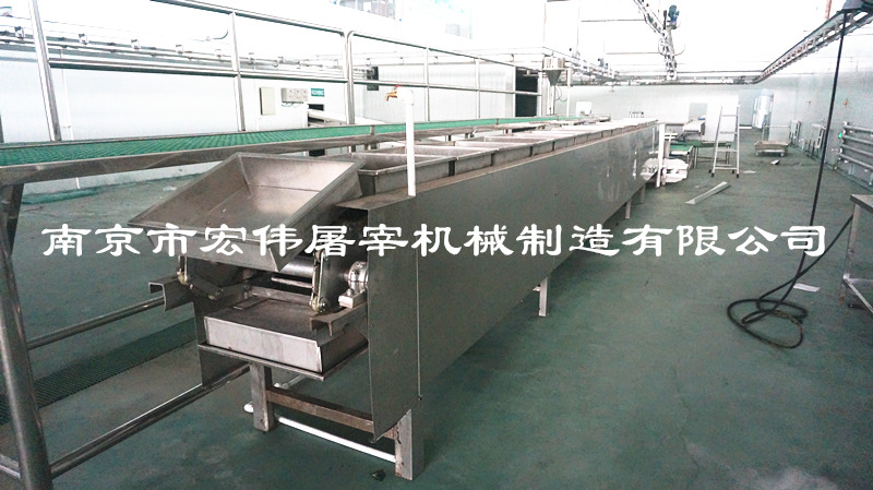 5、同步卫检线上的红内脏挂钩和白内脏托盘自动通过冷-热-冷水的清洗和消毒。